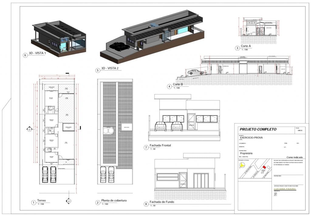 O projeto exercício é um prédio de 8 andares com 4 apartamentos por andar. A escolha deste projeto está vinculado à aplicação dos principais comandos para a elaboração de projetos, tais como vistas, cortes, 3D, eixos de alinhamento, pilares, vigas, lajes, paredes, portas, janelas, pisos de revestimento, forros, telhado, escadas, mobiliários, identificados de ambiente, textos, cotas, montagem de pranchas, impressão, entre outros.